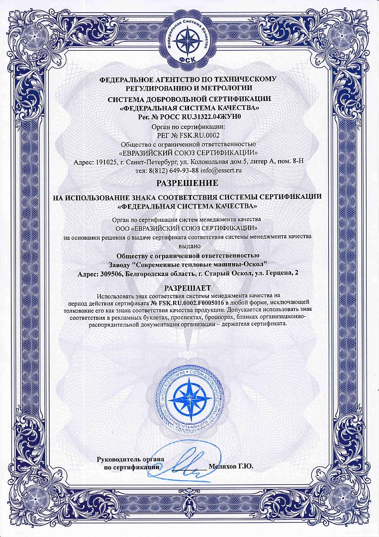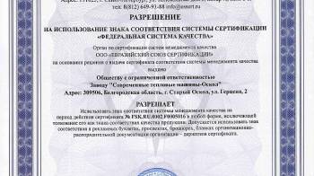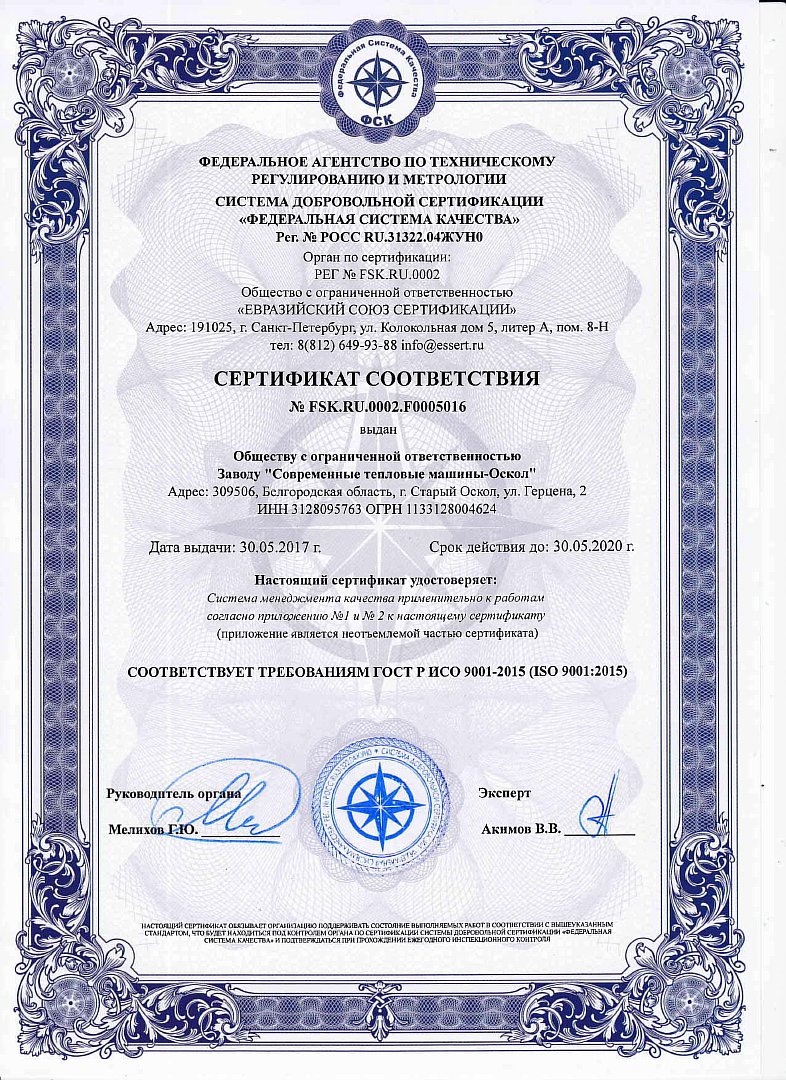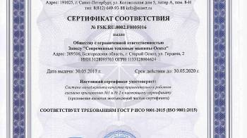 Cертификат ИСО ООО Завод «Современные тепловые машины-Оскол»